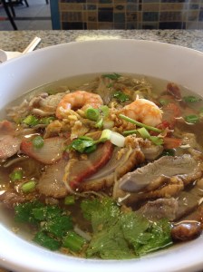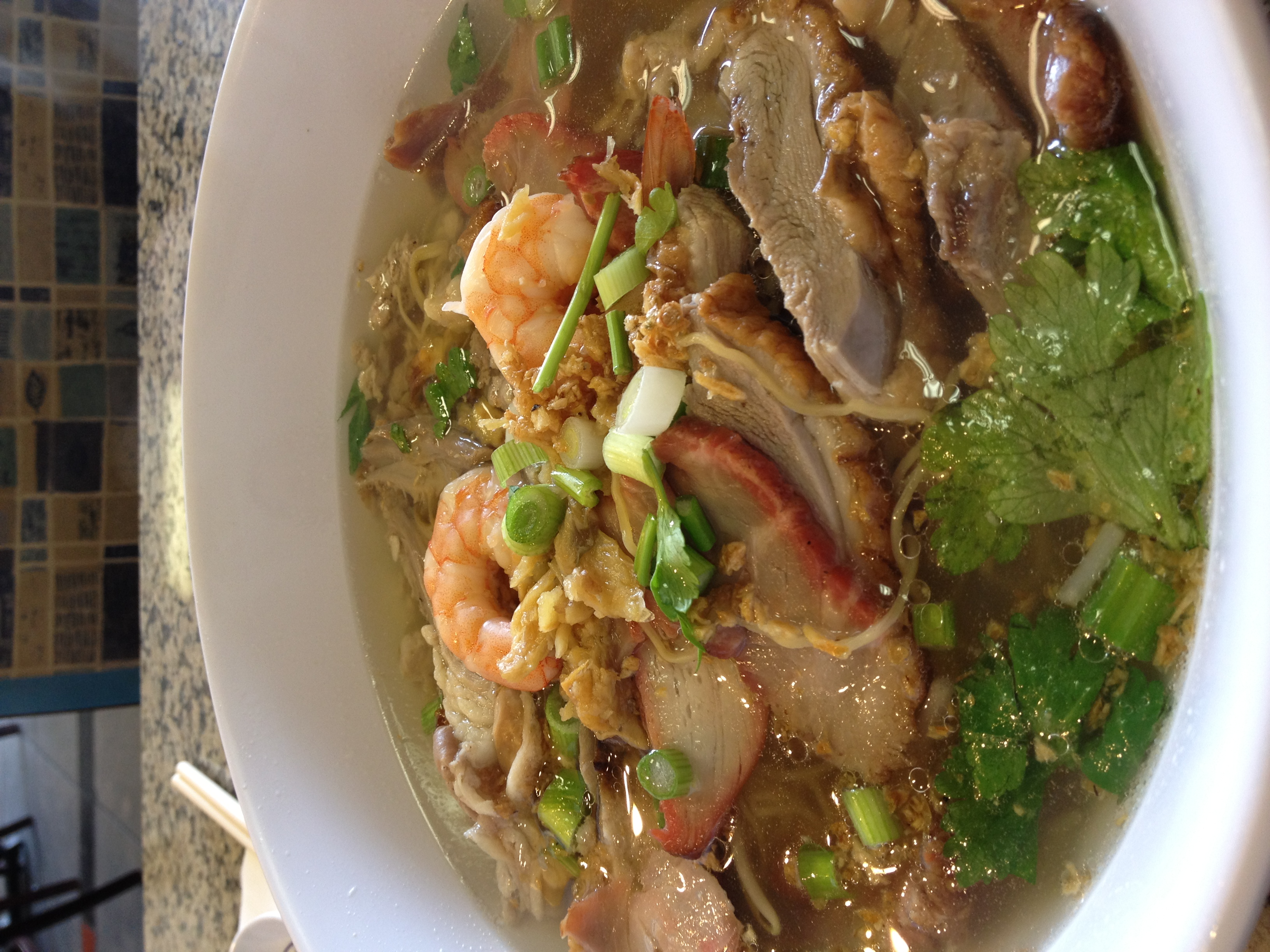 More accurately I’m full of them – noodles… and BBQ pork and ground pork and shrimp and roasted duck and bean sprouts and various other vegetables and something else a little crunchy on top. Good hot broth (not a spicy one until doctored with rooster sauce) with lovely dots of fat on the surface.