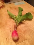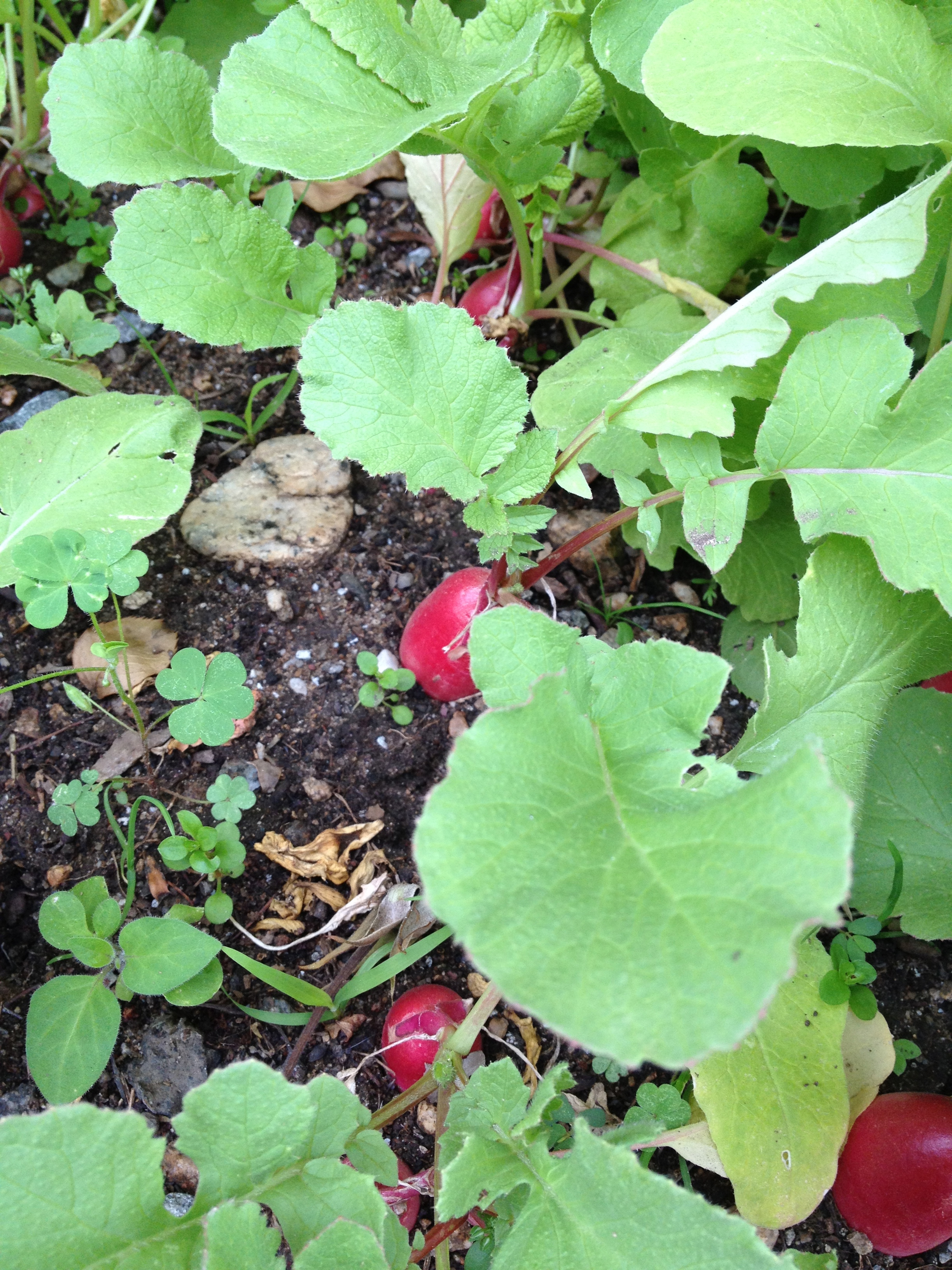 little “18 inch farm” planted along the back wall of the houses where we get sun is thriving. This morning I picked a couple of lovely breakfast radishes.