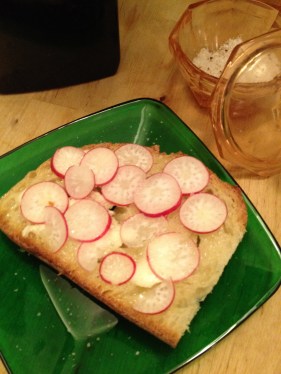 The first I just rinsed and ate but the second made it into the house. Toasted bread, butter, thinly sliced radish and GOOD salt. That’s what I call breakfast!