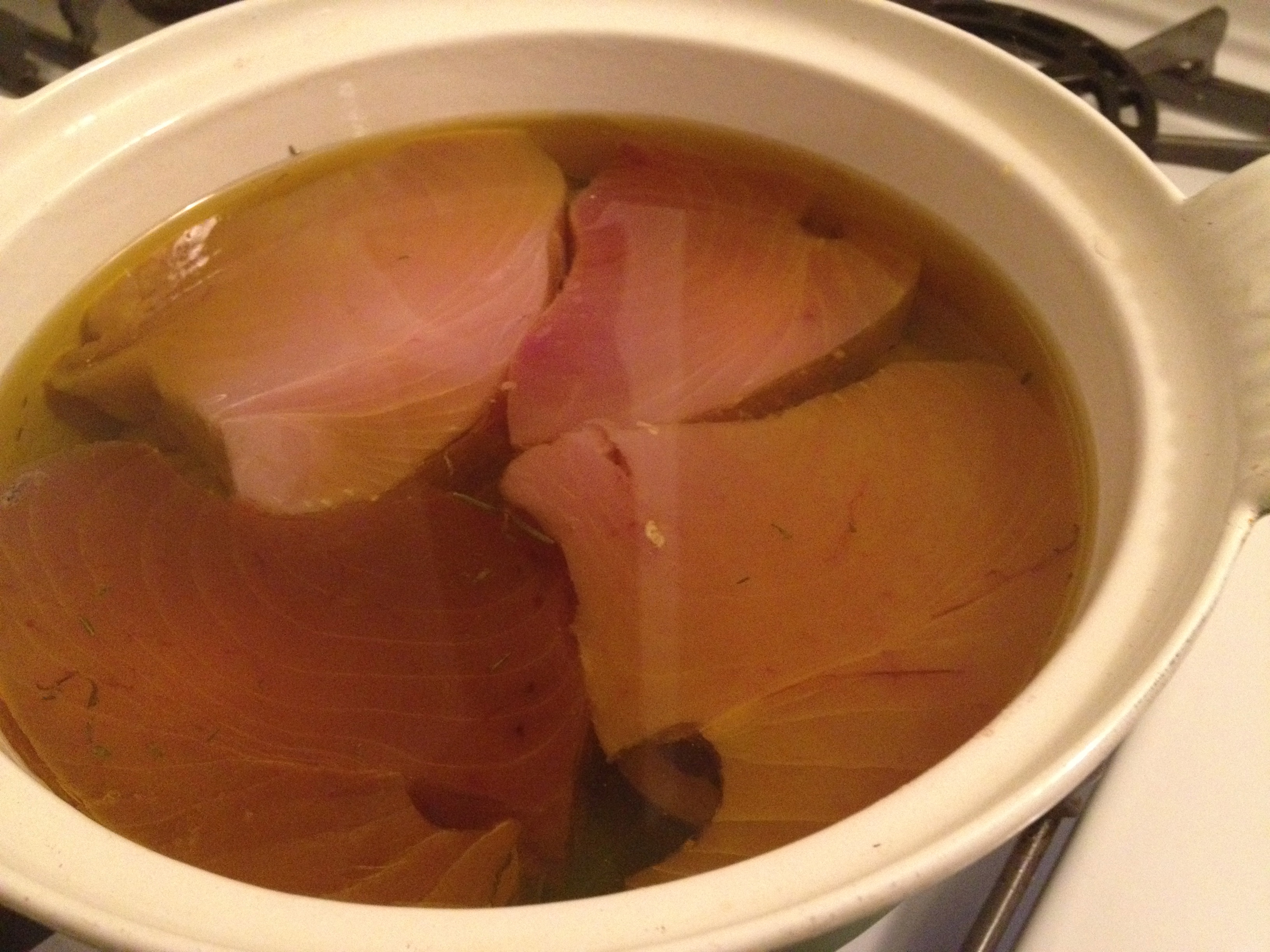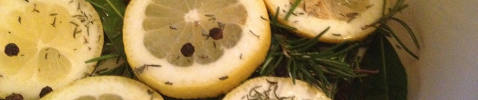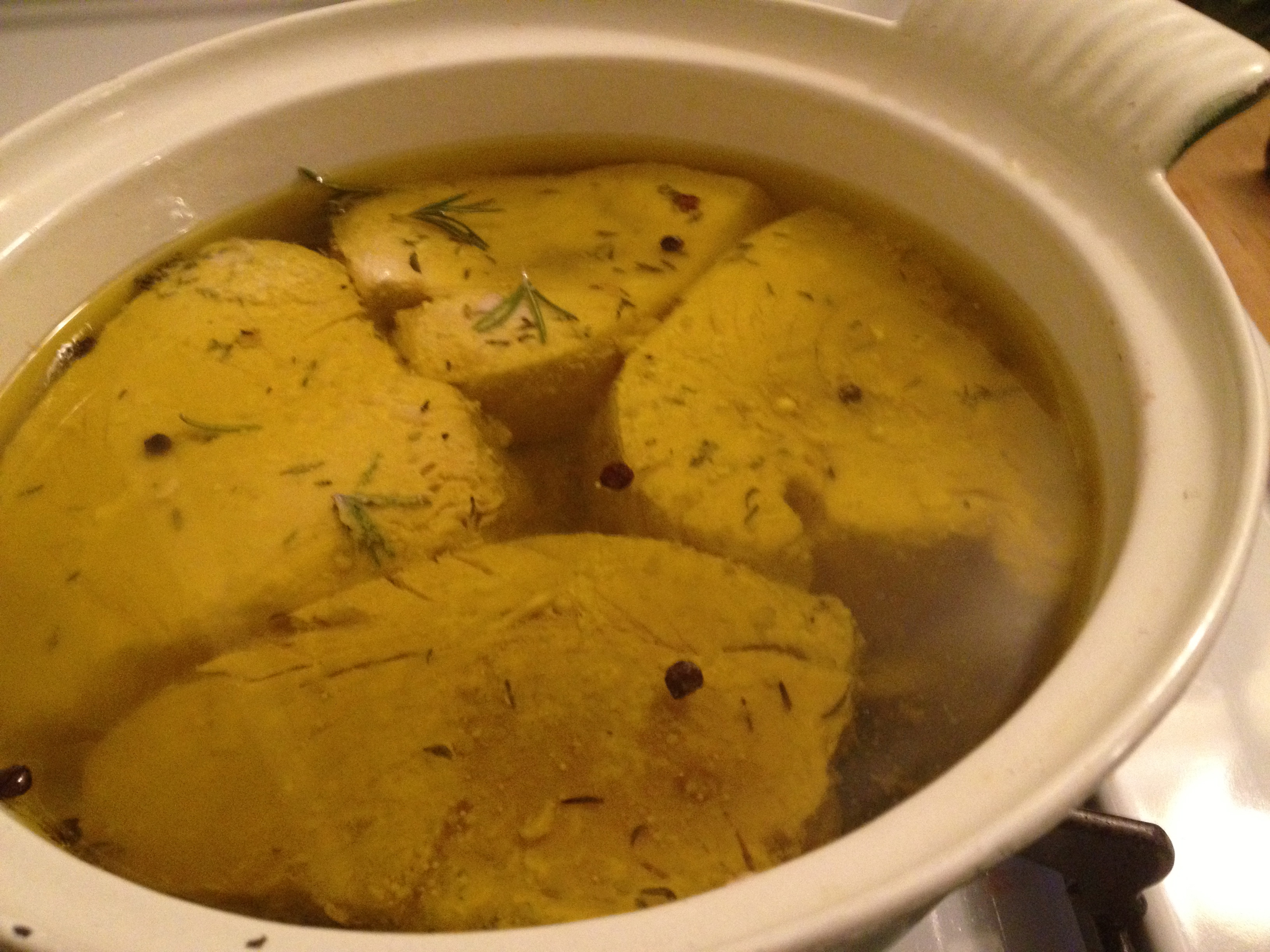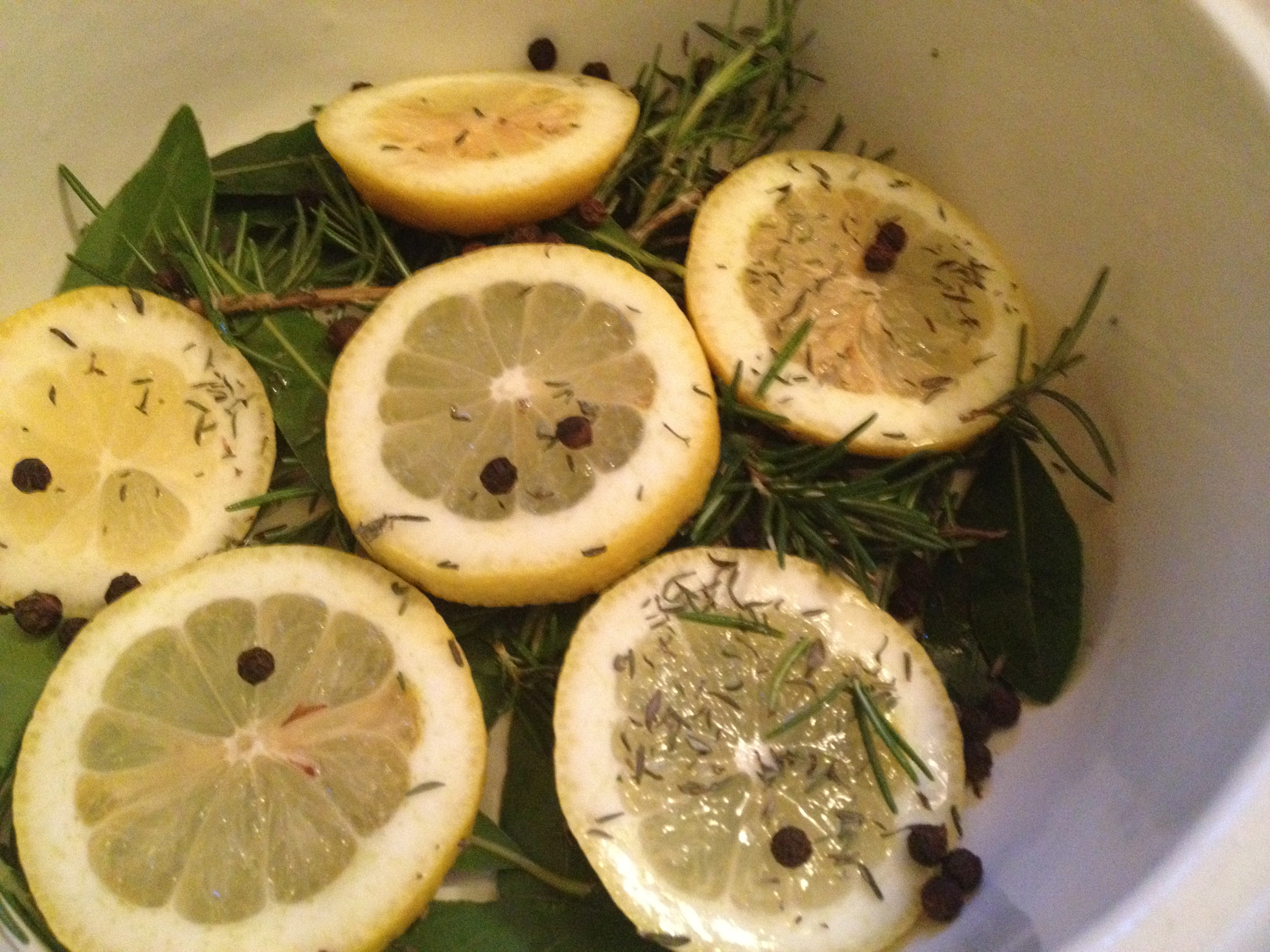 Layer the bottom of a heavy pot (just the size to hold the tuna in one layer) with lemon slices, bay leaves, rosemary, thyme and pepper corns.