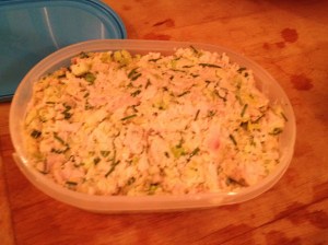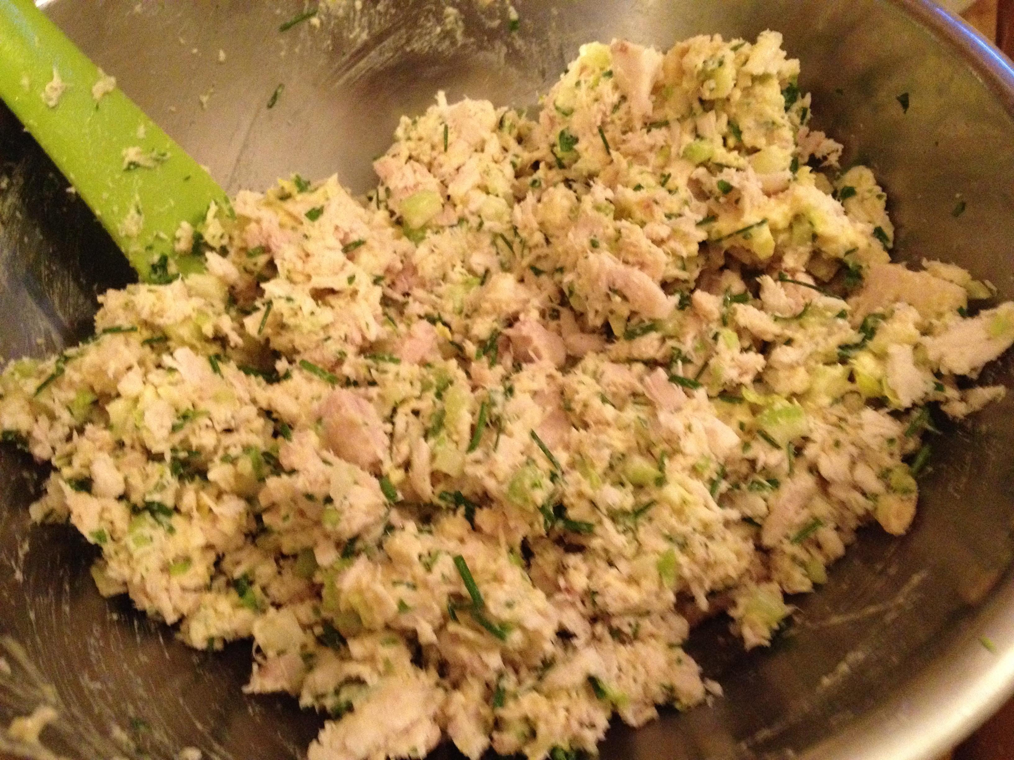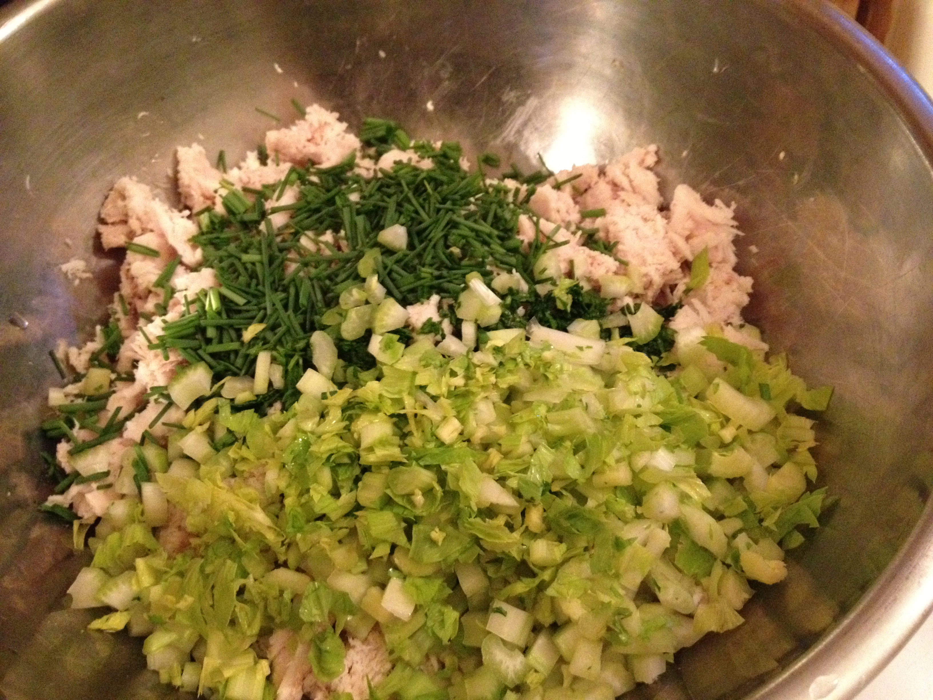 Wash your hands well again. Offer them to the cat to smell. He will tell you if you got all the tuna smell off of them… Careful not to get bitten. Add 1/2 cup finely diced celery (I like to to use the very tender inner stalks and some of the pale green leaves), and a 1/4 cup each chives and parsley. Throw in any other veggies, pickles, olives, herbs you wish. Add the mayo and mix. Salt to taste.