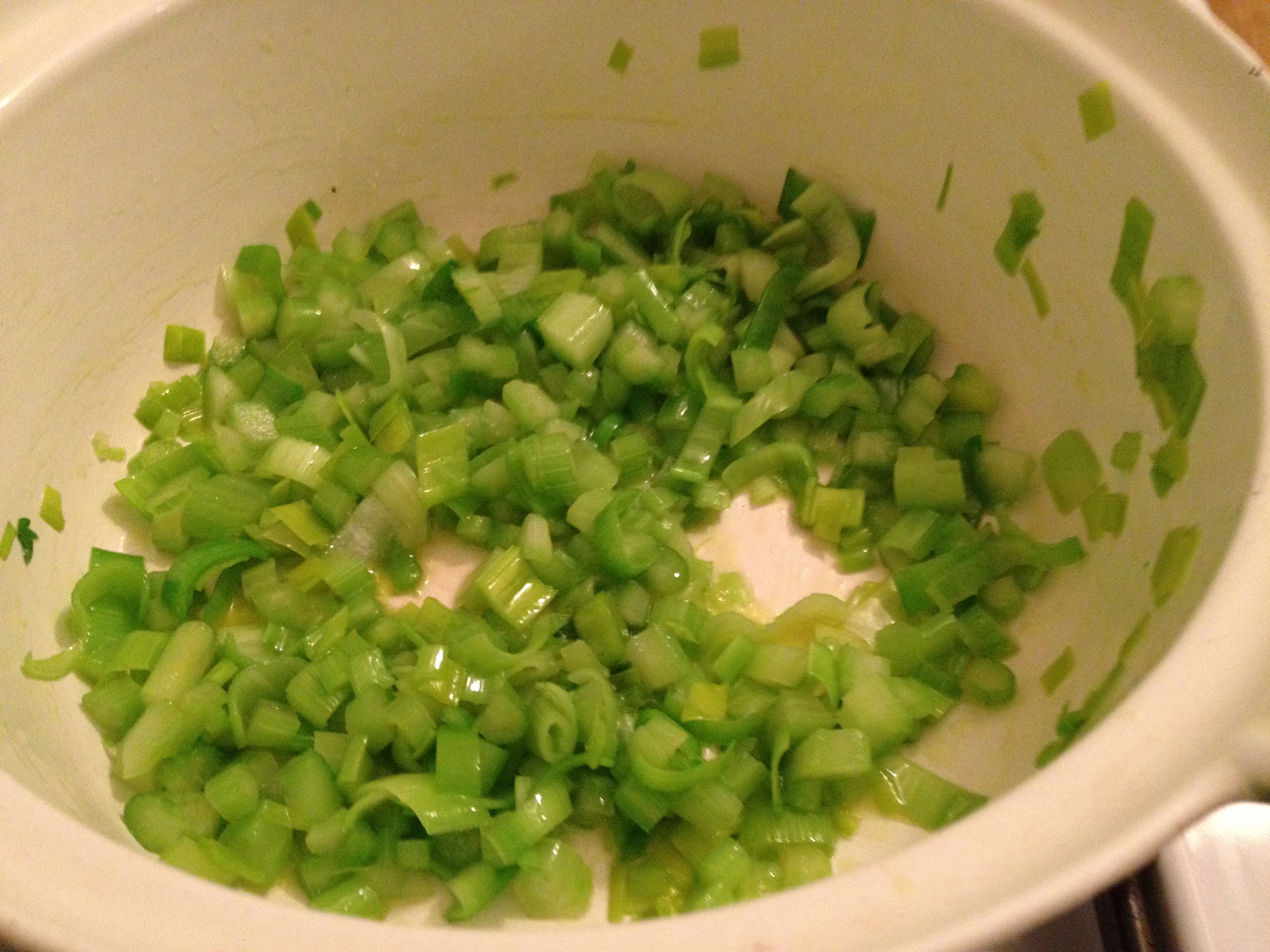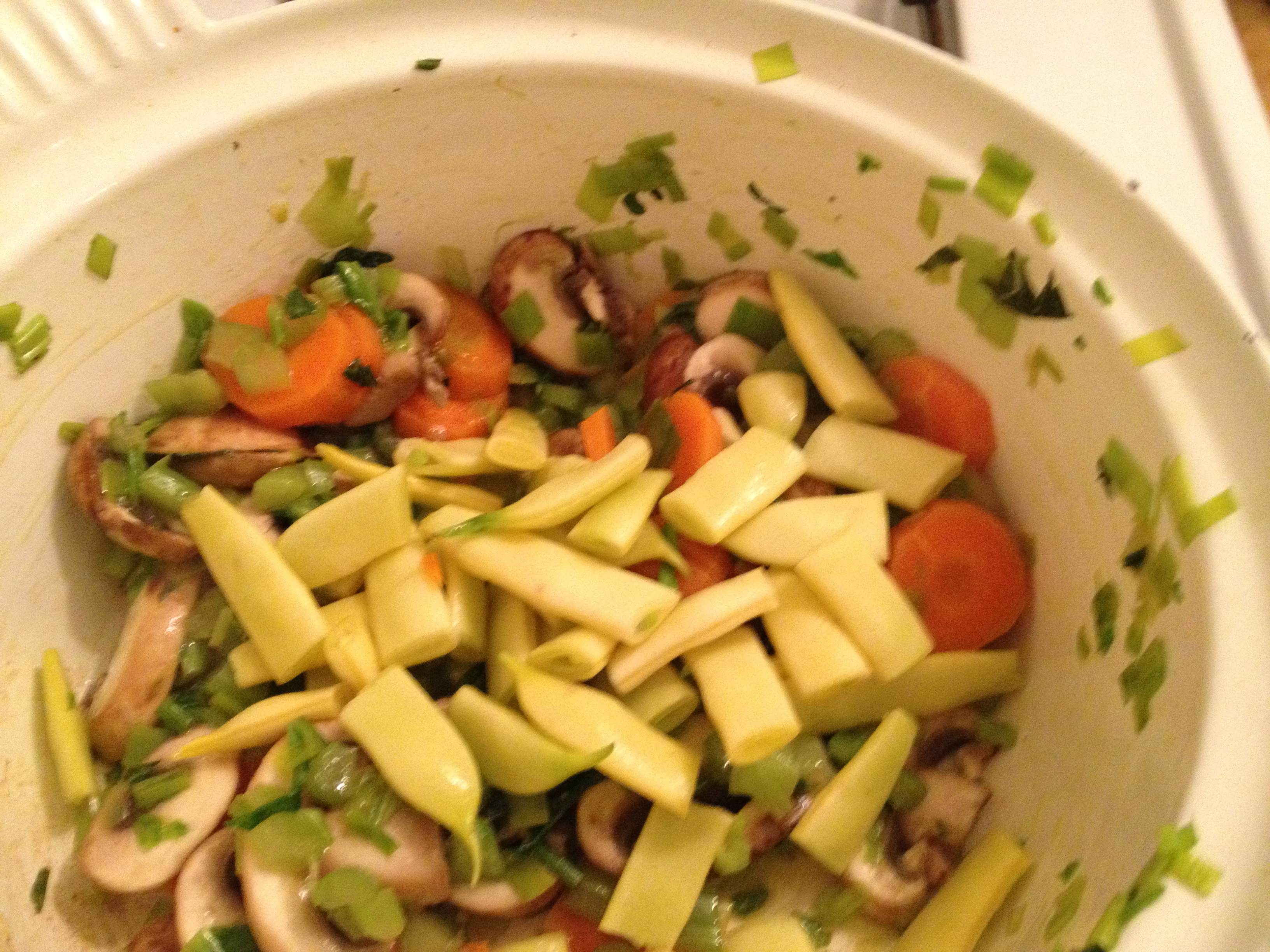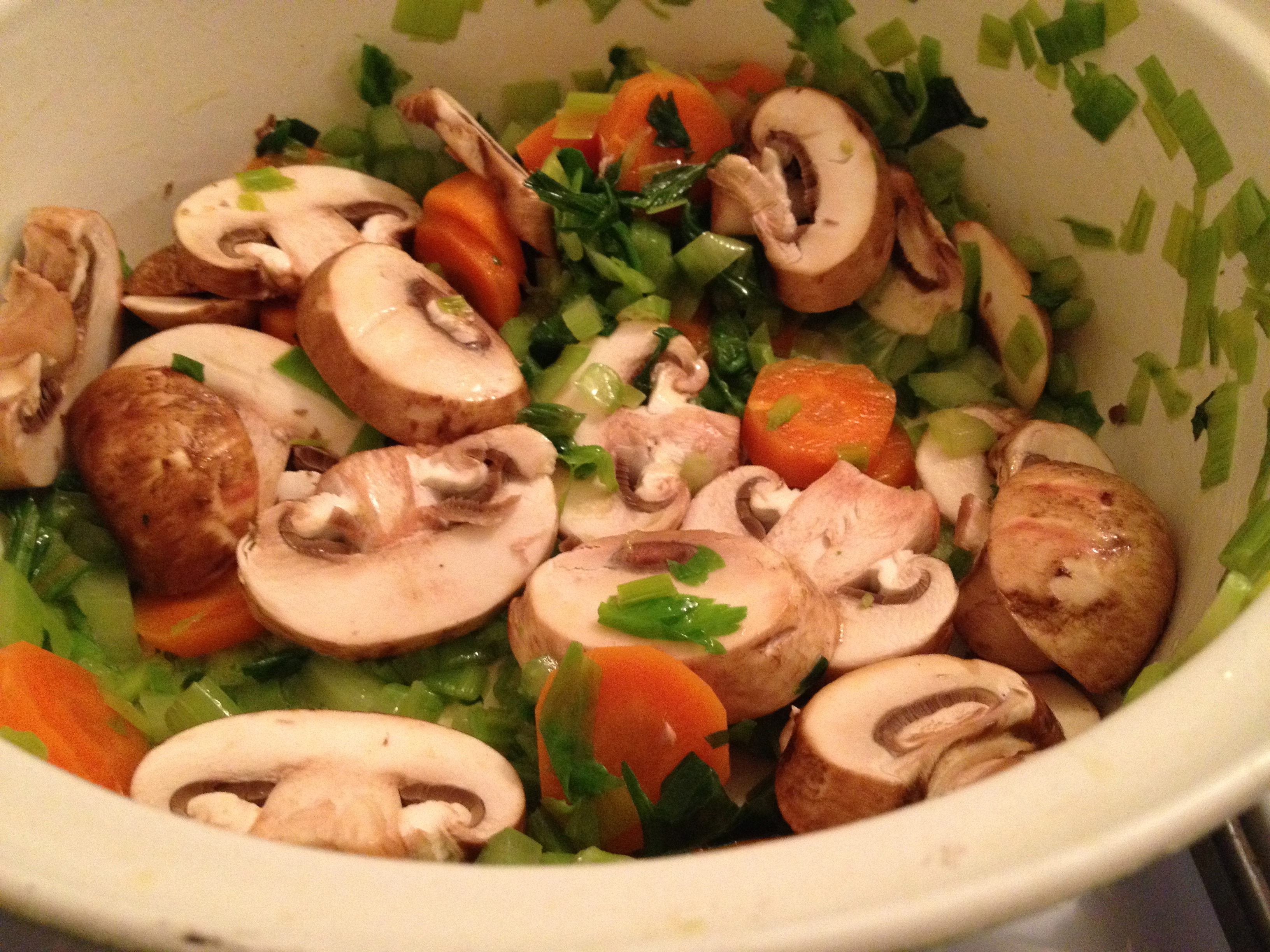 Start with the leeks and celery. Add the carrots. Then the mushrooms and the beans.