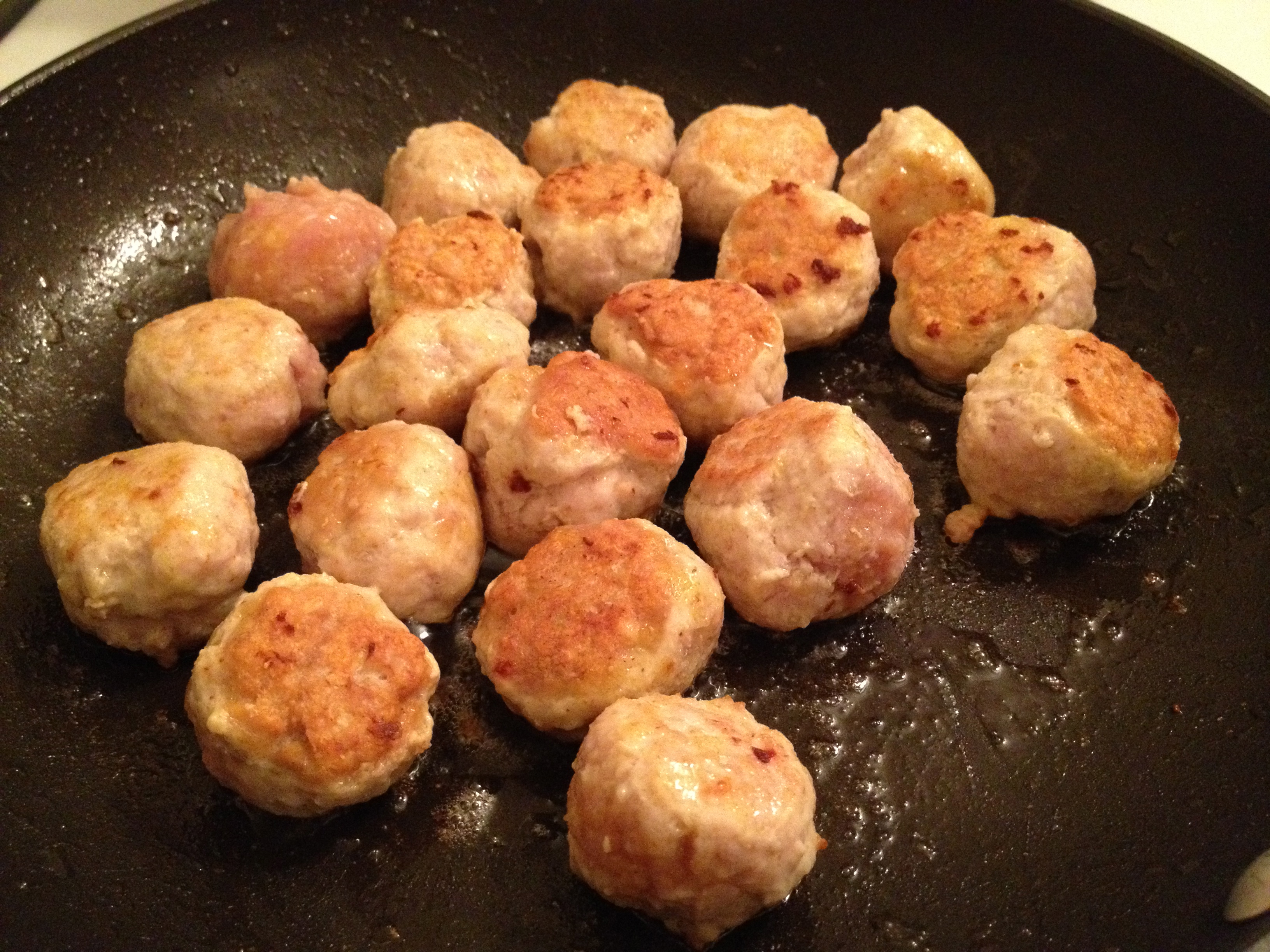 Finally the quinoa and stock. Set it to simmer for about 20 minutes while you make the meatballs. About 2/3 pound ground chicken, panko breadcrumbs, raz el hanout, a small egg, salt and pepper. Brown in a skillet; turn down and a continue cooking until done through.