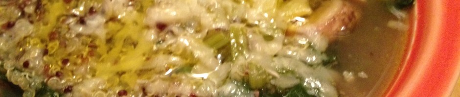 When I make vegetable soup it is based in large part on what’s in the house. Last week I made a batch of chicken stock. My friend Sally Kemp has been touting the benefits of kale on FaceBook so there’s the inspiration. What else in is in the produce drawer? Always – carrots, mushrooms, celery; in the pantry – quinoa (could have gone with the wild rice just as easily), panko bread crumbs to make the meatballs and raz el hanout to season them.