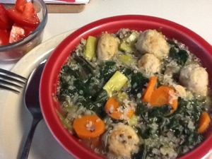 Yes, for those of you who are really paying attention there was no #4. I lost track (so soon!) and used #3 twice. This is quinoa and vegetable soup that I made a couple of weeks ago. I made quite a lot and got tired of it so I bagged it up and threw it in the freezer. This morning, thinking that I should bring lunch since I might stay in town and go to synagogue tonight (therefore meeting up with friends and going to dinner before) I grabbed this out of the freezer. It wasn’t until it was melting down in the nuclear oven (why don’t we call them that -it sounds so Jetsons) that I remembered the di-yummy chicken meatballs. There’s also mushrooms and Romano beans along with the kale and carrots that I could see while it was still in the bag.