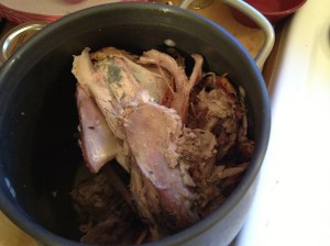 The bones go into the pot with celery, carrot, onion, sage, bay, thyme and S&P and the pan drippings go into a jar. On Saturday I will roast a turkey thigh on top of a pan of dressing and make gravy. On Sunday I’ll make vegetable barley soup.