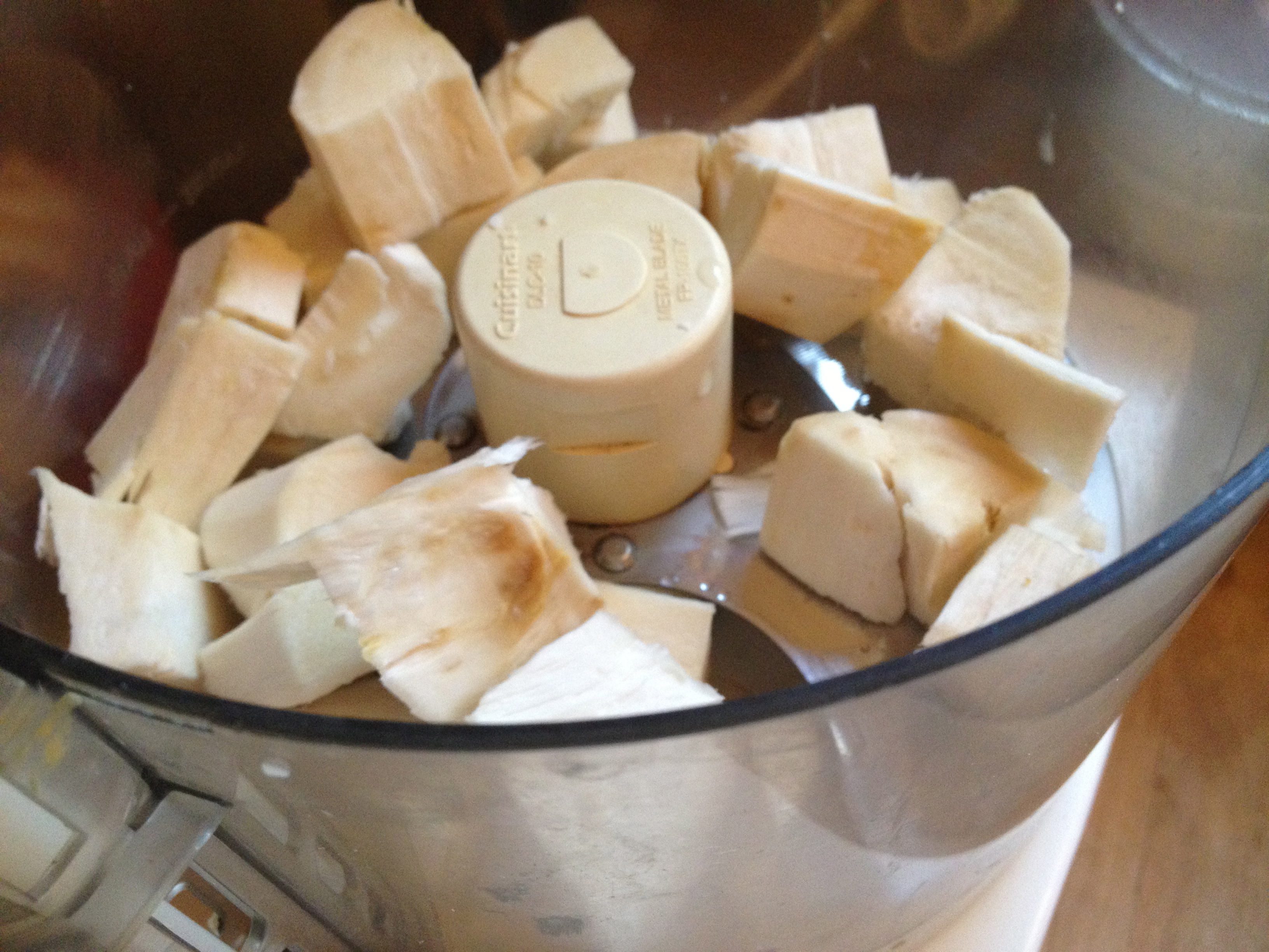 Peel and cut about half a large horseradish root into chunks and put it in the blender or food processor with at least a cup of vodka. After making it in the food processor I would strongly suggest using a blender as there was quite a lot of splash and clean-up to do. Run the machine until the horseradish it fairly fine (but not as fine as prepared horseradish). Pour it into a quart mason jar and fill with vodka. Leave it on the counter for a few days shaking the jar each time you pass through the room. Strain through a fine mesh strainer (like a tea strainer) and pour back into the bottle with the remaining vodka.