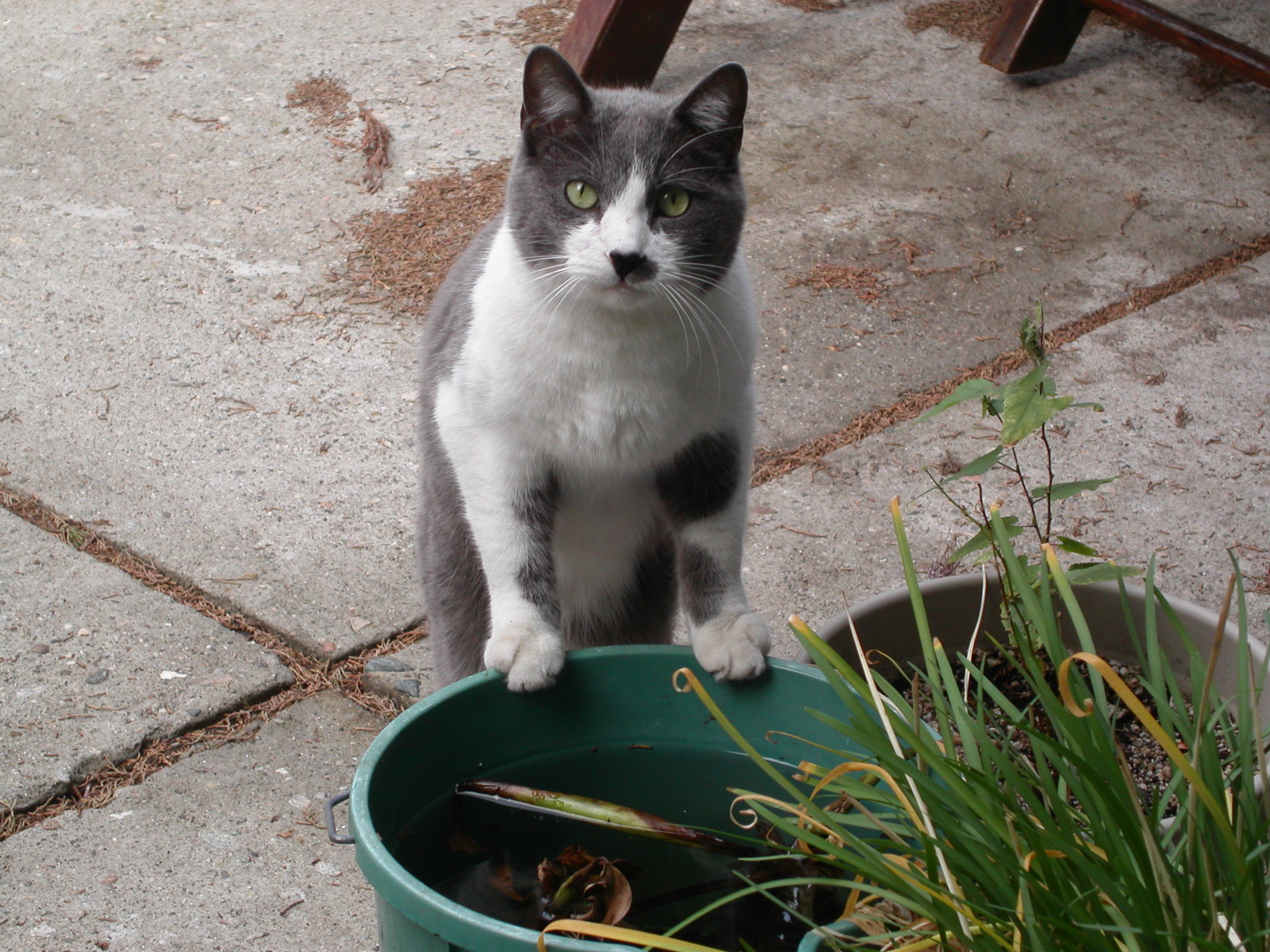 One night in the fall of 1999 a small grey and white kitten hesitantly approached me when I got out of my car in the dark. It was nervous and I could not get close to it as it kept a safe distance between us. I went in the house, but by the time I returned with some food he was gone.