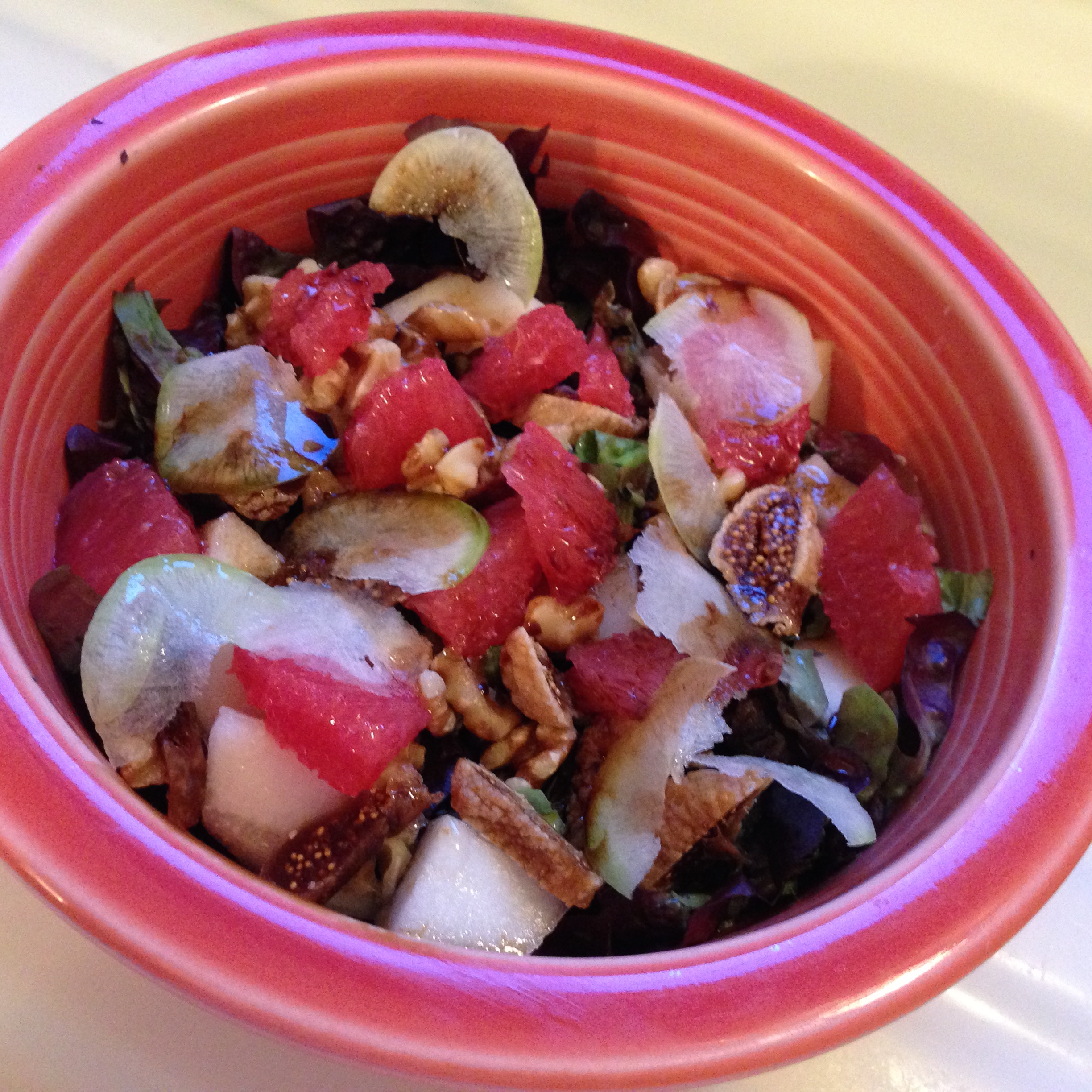For today I will leave you with these thoughts – always bake a tester. We had pecan pie and ice cream last night and I made it all the way to 9:38 this morning before dipping back into it. Then I countered it with this lovely winter salad for lunch – red lettuce, pear, ruby red grapefruit imperials, figs, walnuts and paper thin slices of radish with a walnut oil and fig balsamic dressing. It’s always important to maintain a balanced diet, not to mention a balanced life.