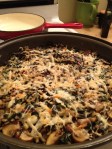 Simmer the wild rice in a 1 QT saucepan for 10 minutes, add the rice and cook 35 minutes. In a nonstick 10” ovenable skillet sauté the shallots in olive oil until soft, add mushrooms and chard cook just until well wilted. Add salt pepper and herbs
