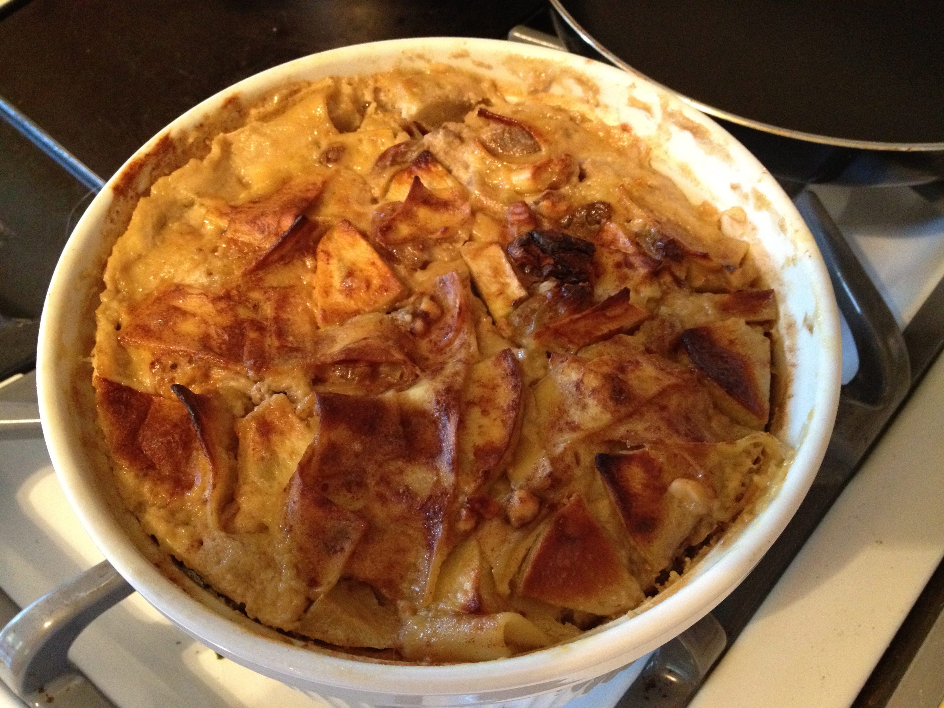 Beat the eggs and other dairy ingredients together. Add olive oil, seasonings and sugar. Fold in raisins, apples, noodles and nuts. Pour into casserole and sprinkle more cinnamon on top.